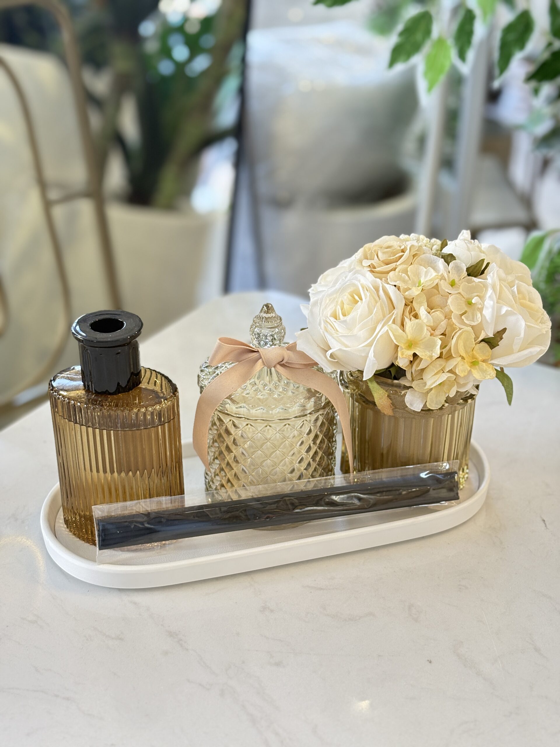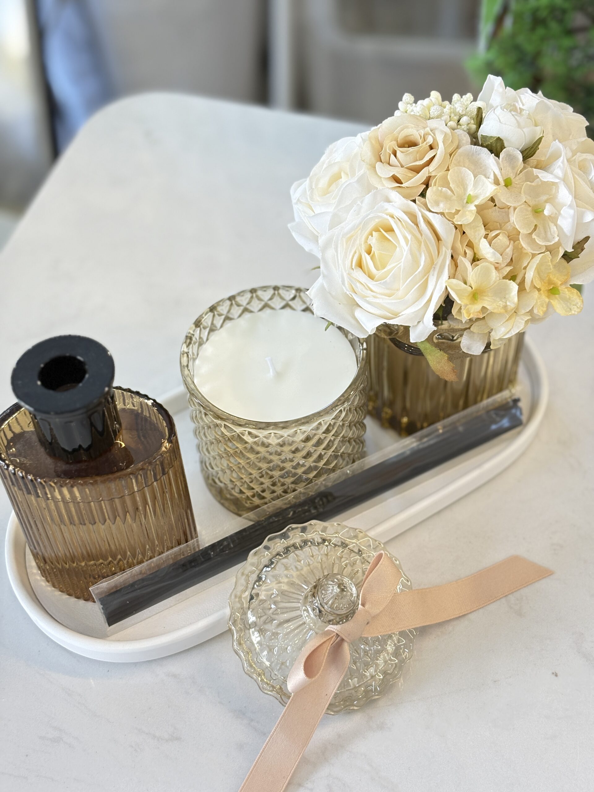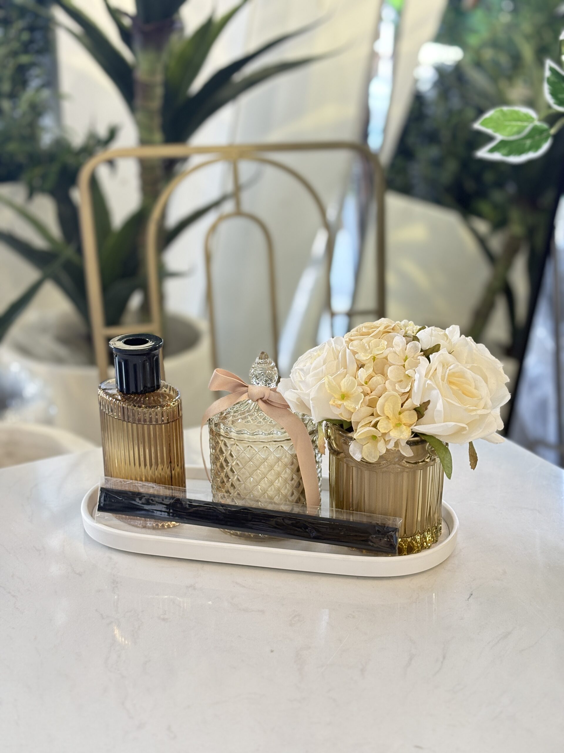 بكج اروما ديكور ومعطر يشمل شمعة مع ورد و ومعطر جو اعواد مع صينية