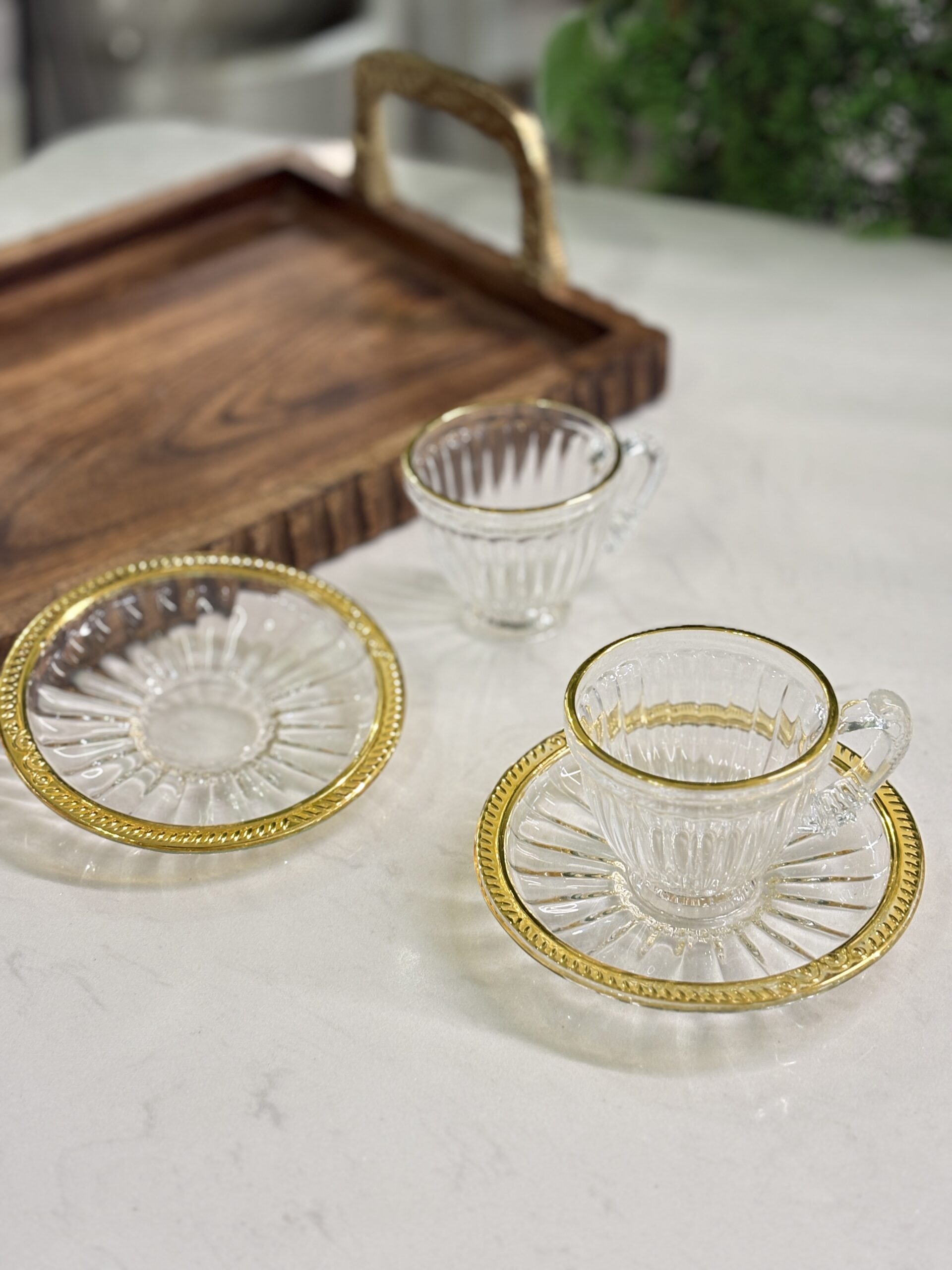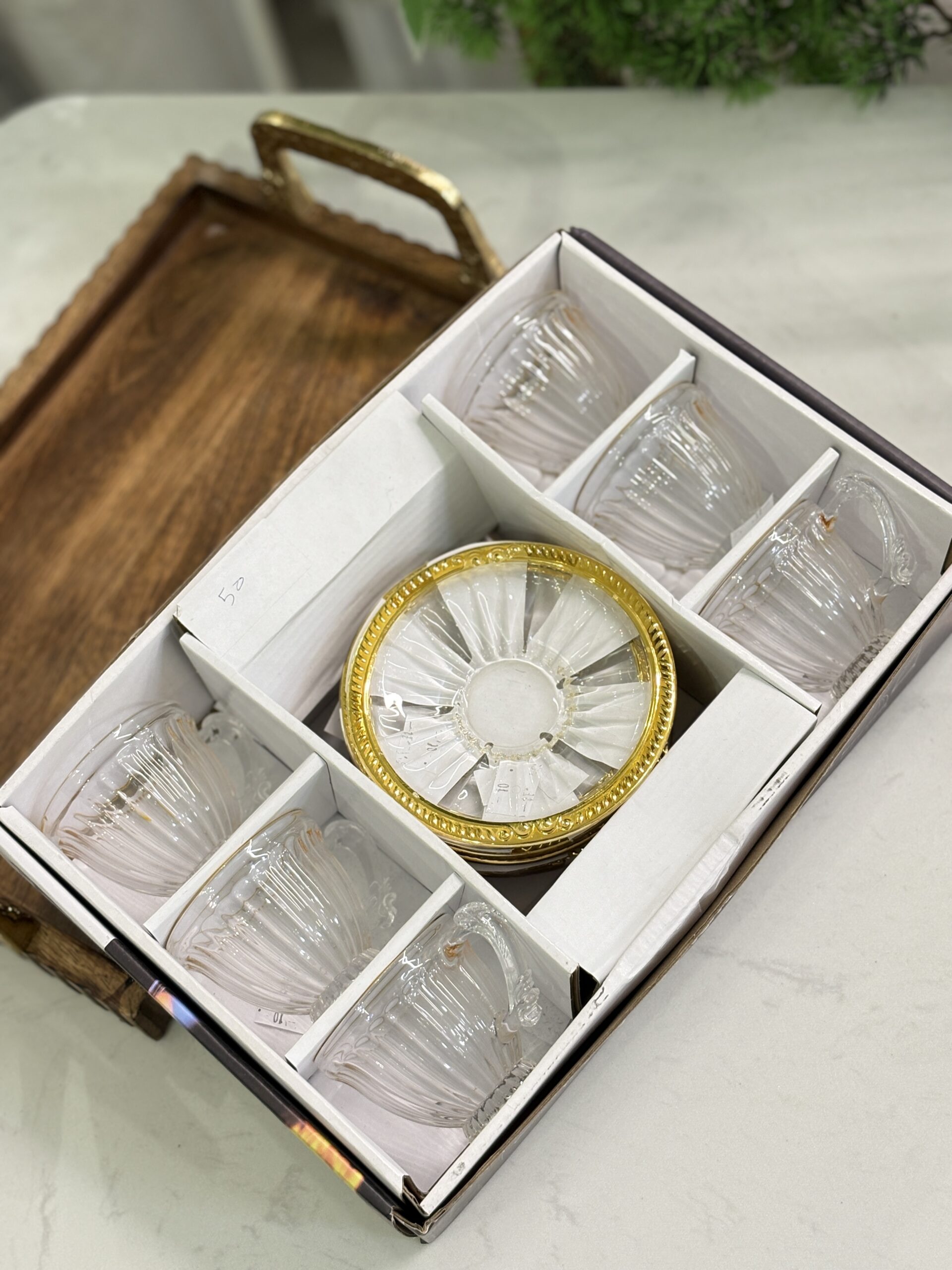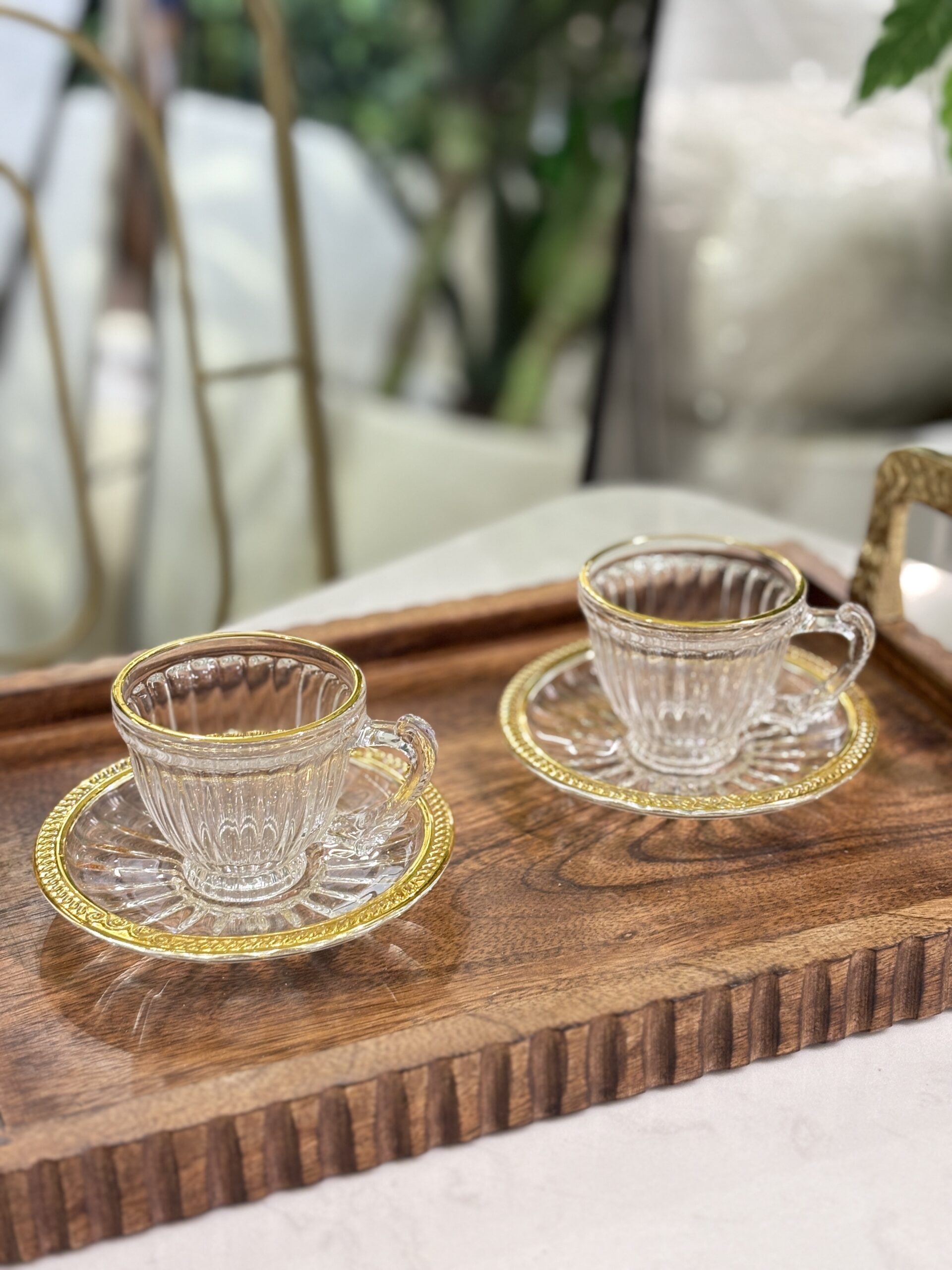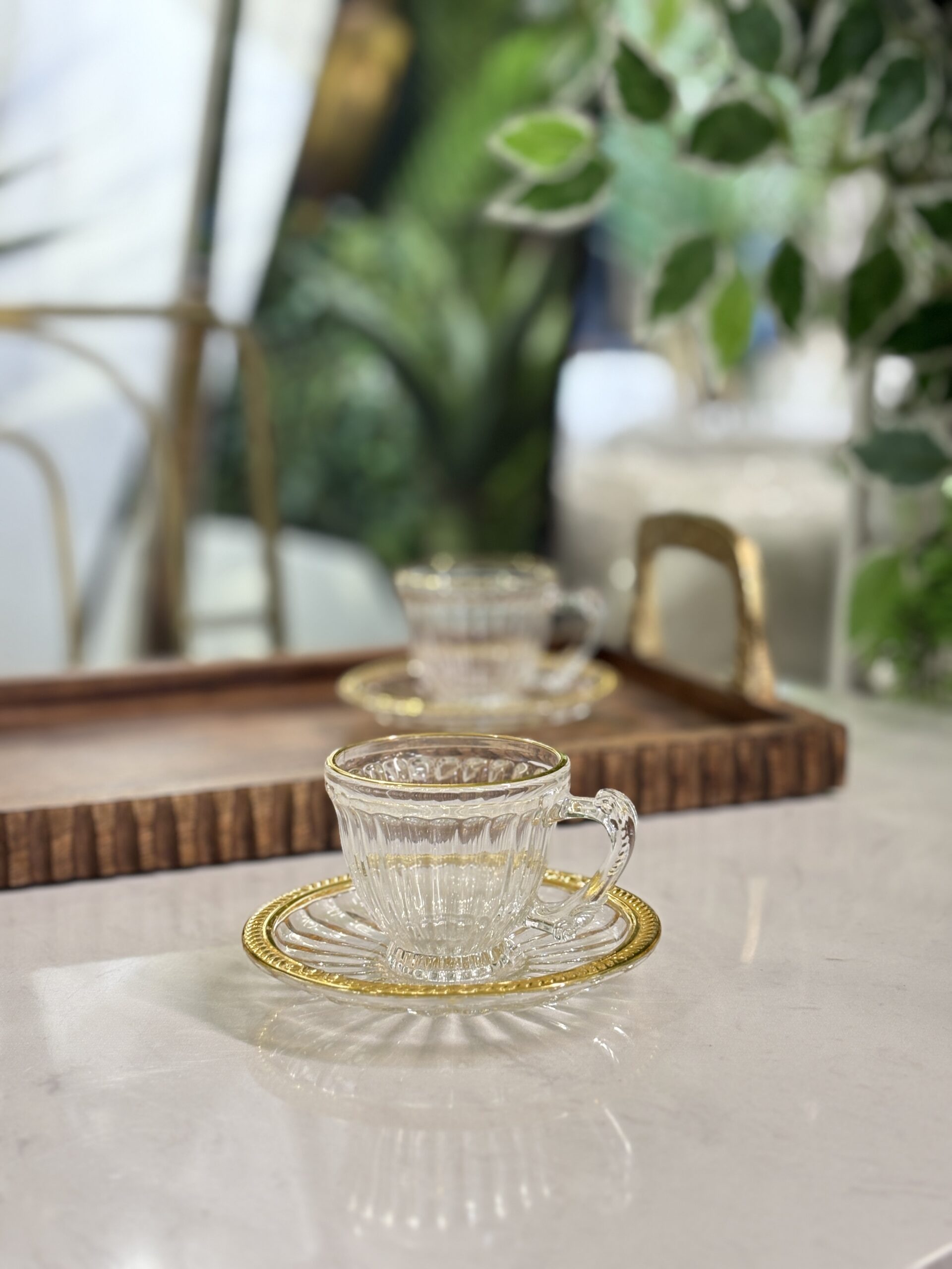 كمية طقم 6/6 فنجان قهوة 90 مل زجاج ساده محزز حيف ذهبي